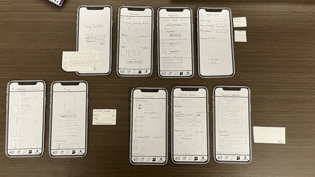 The first version of PageTurner that started to resemble an app was the lo-fi prototype. This was made out of several pieces of paper cut to roughly the size of a smartphone, which I wrote on with pencil. I also included small pop up windows on separate small pieces of paper, so that it would feel more similar to the actual app-using experience. Below are the pages and pop-ups I created: